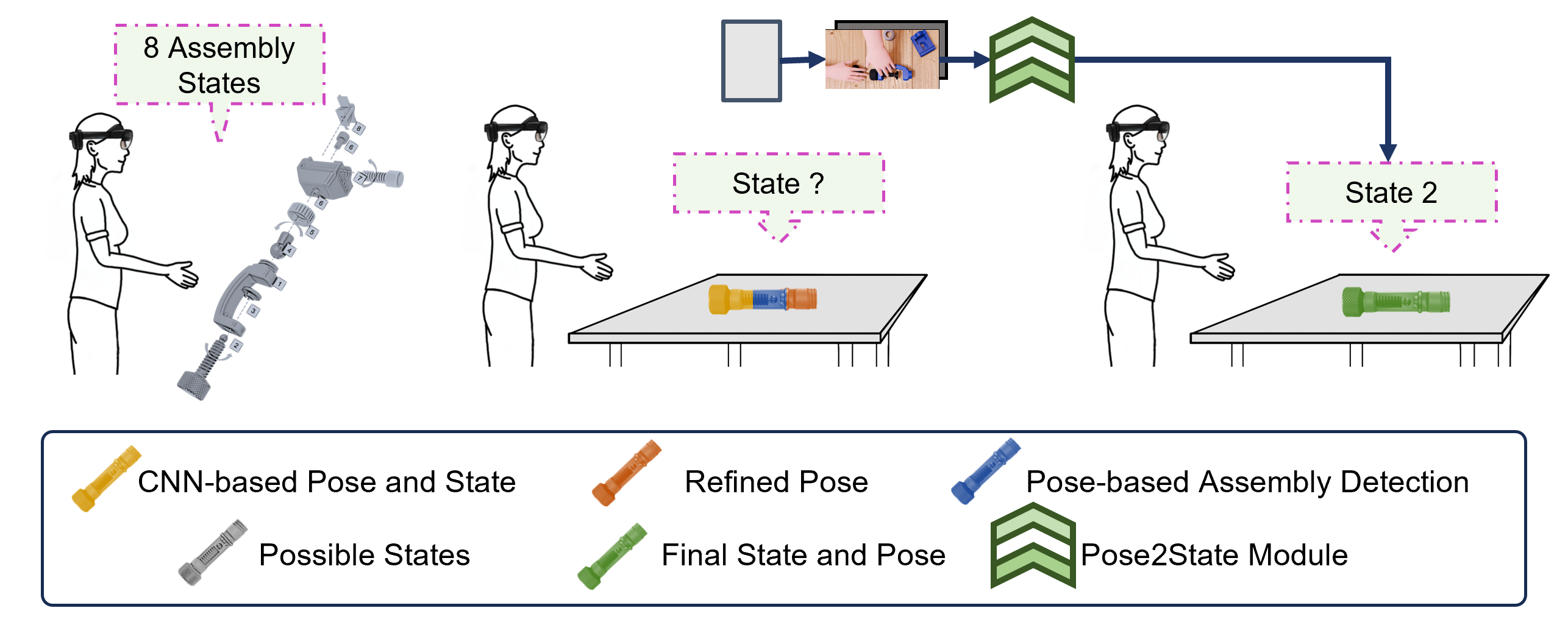 In medical and industrial domains, providing guidance for assembly processes is critical to ensure efficiency and safety. Errors in assembly can lead to significant consequences such as extended surgery times, and prolonged manufacturing or maintenance times in industry. Assembly scenarios can benefit from in-situ Augmented Reality (AR) visualization to provide guidance, reduce assembly times and minimize errors. To enable in-situ visualization 6D pose estimation can be leveraged. Existing 6D pose estimation techniques primarily focus on individual objects and static captures. However, assembly scenarios have various dynamics including occlusion during assembly and dynamics in the assembly objects appearance. Existing work, combining object detection/6D pose estimation and assembly state detection focuses either on pure deep learning-based approaches, or limit the assembly state detection to building blocks. To address the challenges of 6D pose estimation in combination with assembly state detection, our approach ASDF builds upon the strengths of YOLOv8, a real-time capable object detection framework. We extend this framework, refine the object pose and fuse pose knowledge with network-detected pose information. Utilizing our late fusion in our Pose2State module results in refined 6D pose estimation and assembly state detection. By combining both pose and state information, our Pose2State module predicts the final assembly state with precision. Our evaluation on our ASDF dataset shows that our Pose2State module leads to an improved assembly state detection and that the improvement of the assembly state further leads to a more robust 6D pose estimation. Moreover, on the GBOT dataset, we outperform the pure deep learning-based network, and even outperform the hybrid and pure tracking-based approaches.
