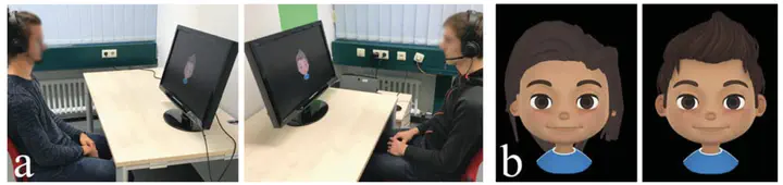 Apparatus. a) Exemplary setup. Two remote users interact with each other via avatars. b) The avatars. Humanoid but abstracted avatars were chosen to avoid any social information bias and avatars were matched to the participants gender.Autism Spectrum Disorders (ASD) are neurodevelopmental disorders that are associated with characteristic difficulties to express and interpret nonverbal behavior, such as social gaze behavior. The state of the art in diagnosis is the clinical interview that is time intensive for the clinicians and does not take into account any objective measures of behavior. We herewith propose an empirical approach that can potentially support diagnosis based on the assessment of nonverbal behavior in avatar-mediated interactions in virtual environments. In a first study, ASD individuals and a typically developed control group were interacting in dyads. Head motion, and eye gaze of both interlocutors were recorded, replicated to the avatars and displayed to the partner through a distributed virtual environment. The nonverbal behavior of both interaction partners was recorded, and resulting preprocessed data was classified with up to 92.9parcent classification accuracy, with the amount of eye area focus and the average horizontal gaze change being the most relevant features. We expect that such systems could improve the diagnostic assessment on the basis of objective measures of nonverbal behavior.