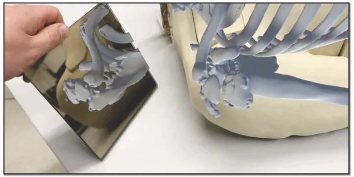 Example of an augmented mirror in orthopedics.A recurrent problem in egocentric Augmented Reality (AR) applications is the misestimation of depth. Providing alternative views from non-egocentric perspectives can convey useful information for applications that require the correct judgment of depth as it is in the case of placement and alignment of virtual and real content, but also for exploration and visualization tasks.In this paper, we introduce Augmented Mirrors. Through the integration of a real mirror, our approach is capable to reflect changes of the real and virtual content of an AR application while users benefit from the perceptual advantages of using mirrors. Our concept, simple yet effective, only requires tracking the user and mirror poses with the accuracy demanded by a specific application. To showcase the potential and flexibility of the Augmented Mirrors, we present and discuss multiple examples ranging from alignment, exploration, spatial understanding, and selective content visualization using different AR-enabled devices and tracking technologies. We envision the Augmented Mirrors as a new and valuable concept that can be used in applications that benefit from additional viewpoints and require the simultaneous visualization of real and virtual content.