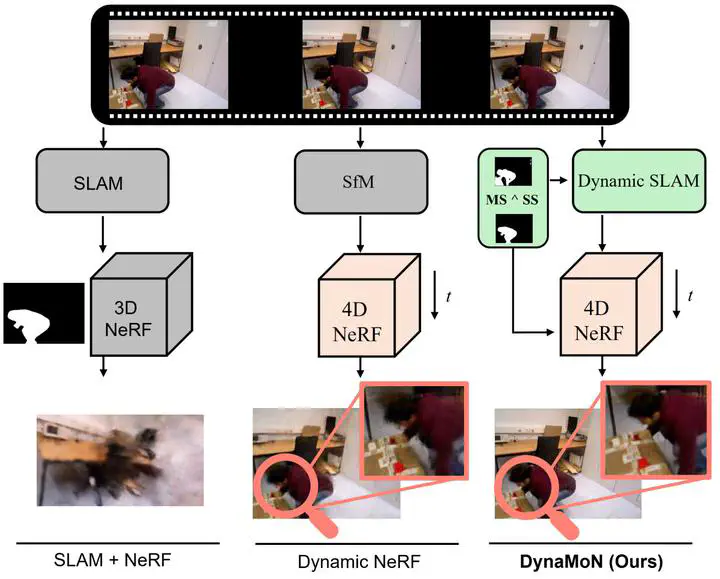 The accurate reconstruction of dynamic scenes with neural radiance fields is significantly dependent on the estimation of camera poses. Widely used structure-from-motion pipelines encounter difficulties in accurately tracking the camera trajectory when faced with separate dynamics of the scene content and the camera movement. To address this challenge, we propose Dynamic Motion-Aware Fast and Robust Camera Localization for Dynamic Neural Radiance Fields (DynaMoN). DynaMoN utilizes semantic segmentation and generic motion masks to handle dynamic content for initial camera pose estimation and statics-focused ray sampling for fast and accurate novel-view synthesis. Our novel iterative learning scheme switches between training the NeRF and updating the pose parameters for an improved reconstruction and trajectory estimation quality. The proposed pipeline shows significant acceleration of the training process. We extensively evaluate our approach on two real-world dynamic datasets, the TUM RGB-D dataset and the BONN RGB-D Dynamic dataset. DynaMoN improves over the state-of-the-art both in terms of reconstruction quality and trajectory accuracy. We plan to make our code public to enhance research in this area.
