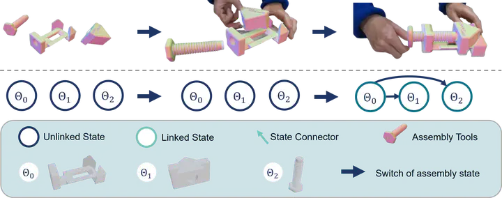 Guidance for assemblable parts is a promising field for augmented reality. Augmented reality assembly guidance requires 6D object poses of target objects in real time. Especially in time-critical medical or industrial settings, continuous and markerless tracking of individual parts is essential to visualize instructions superimposed on or next to the target object parts. In this regard, occlusions by the user’s hand or other objects and the complexity of different assembly states complicate robust and real-time markerless multi-object tracking. To address this problem, we present Graph-based Object Tracking (GBOT), a novel graph-based single-view RGB-D tracking approach. The real-time markerless multi-object tracking is initialized via 6D pose estimation and updates the graph-based assembly poses. The tracking through various assembly states is achieved by our novel multi-state assembly graph. We update the multi-state assembly graph by utilizing the relative poses of the individual assembly parts. Linking the individual objects in this graph enables more robust object tracking during the assembly process. For evaluation, we introduce a synthetic dataset of publicly available and 3D printable assembly assets as a benchmark for future work. Quantitative experiments in synthetic data and further qualitative study in real test data show that GBOT can outperform existing work towards enabling context-aware augmented reality assembly guidance. Dataset and code will be made publically available