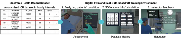 VR simulations are becoming essential for staff training in clinical care, specifically in environments that cannot be trained well during regular operation, such as critical care. This paper presents a novel system that aims at further closing the gap between simulation and reality by integrating real patient data into immersive training scenarios in the context of acute care. Focused on sepsis recognition, the VR simulation introduces trainees to clinical routines and to make informed decisions while observing the evolving patient conditions. By engaging with dynamic disease progression, it fosters understanding of critical conditions in a time-sensitive context. Preliminary feedback from a pilot assessment with nursing professionals highlighted its value for trainees and potential to enhance preparedness and decision-making skills in real-world scenarios.