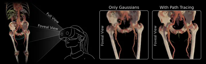 TeaserVolumetric medical imaging offers great potential for understanding complex pathologies. Yet, traditional 2D slices provide little support for interpreting spatial relationships, forcing users to mentally reconstruct anatomy into three dimensions. Direct volumetric path tracing and VR rendering can improve perception but are computationally expensive, while precomputed representations, like Gaussian Splatting, require planning ahead. Both approaches limit interactive use. We propose a hybrid rendering approach for high-quality, interactive, and immersive anatomical visualization. Our method combines streamed foveated path tracing with a lightweight Gaussian Splatting approximation of the periphery. The peripheral model generation is optimized with volume data and continuously refined using foveal renderings, enabling interactive updates. Depth-guided reprojection further improves robustness to latency and allows users to balance fidelity with refresh rate. We compare our method against direct path tracing and Gaussian Splatting. Our results highlight how their combination can preserve strengths in visual quality while re-generating the peripheral model in under a second, eliminating extensive preprocessing and approximations. This opens new options for interactive medical visualization.